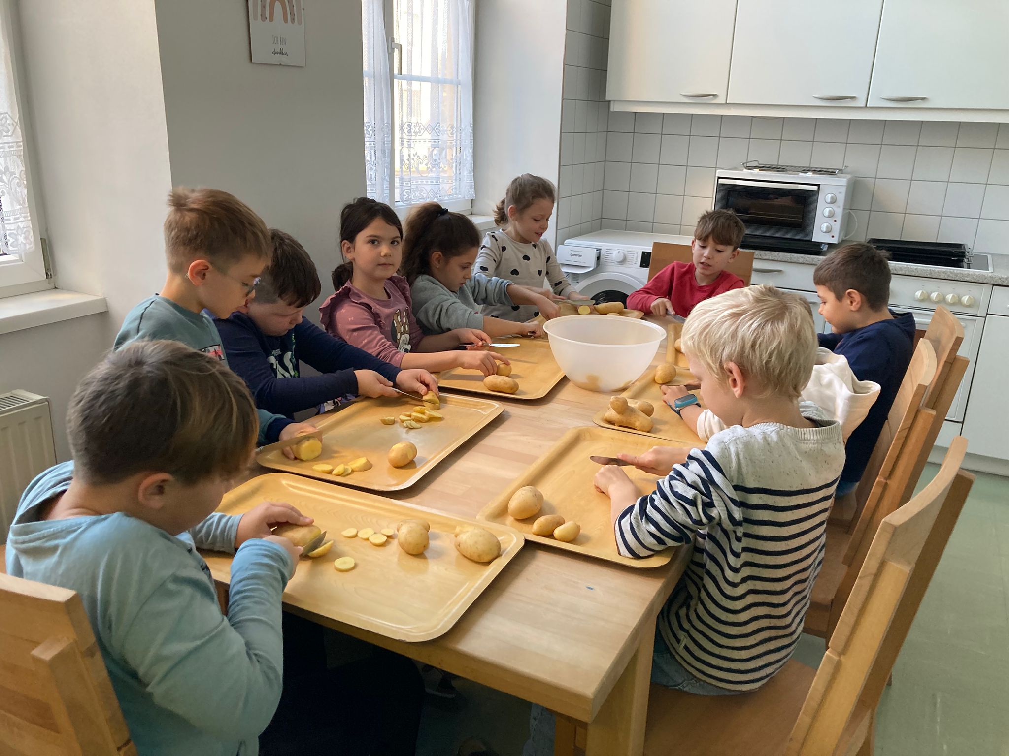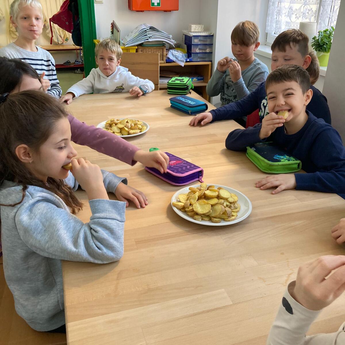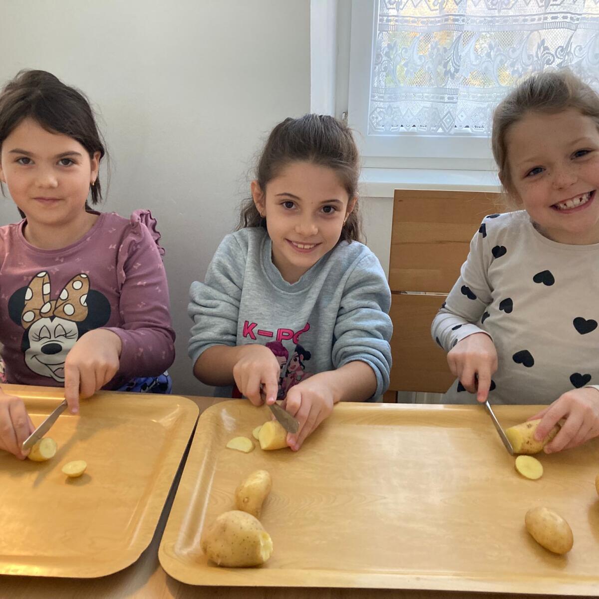 Am 4. November war es so weit - die Kartoffelernte der 3. Klasse wurde endlich verwertet. Dazu marschierten die Kinder 2. Klasse gemeinsam mit ihrer Lehrerin in die Küche, um dort mehrere Kilo Erdäpfel zu schneiden (hier ein Dankeschön an unsere Schulwartin, die zuvor die gesamte Ernte ordentlich gewaschen hat).