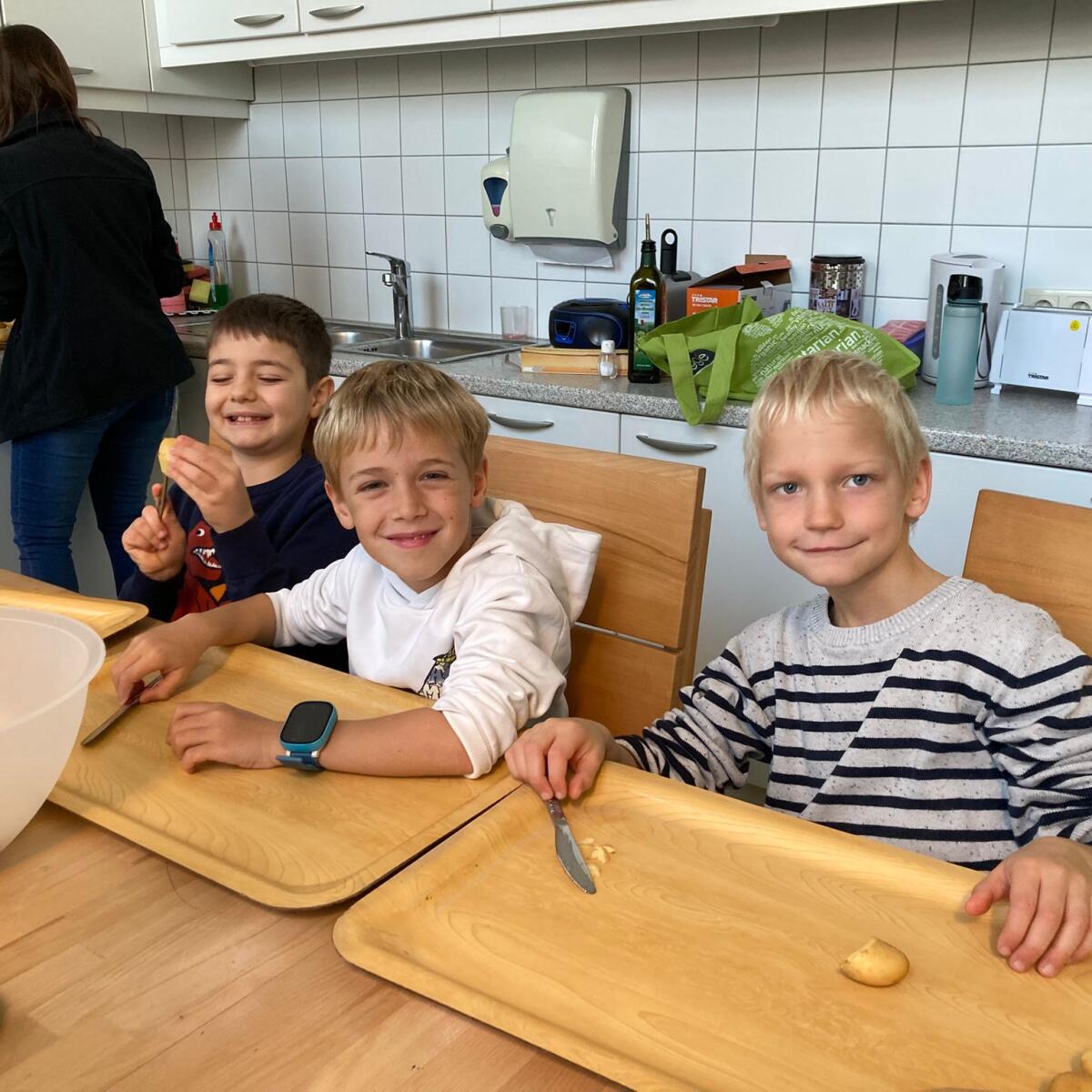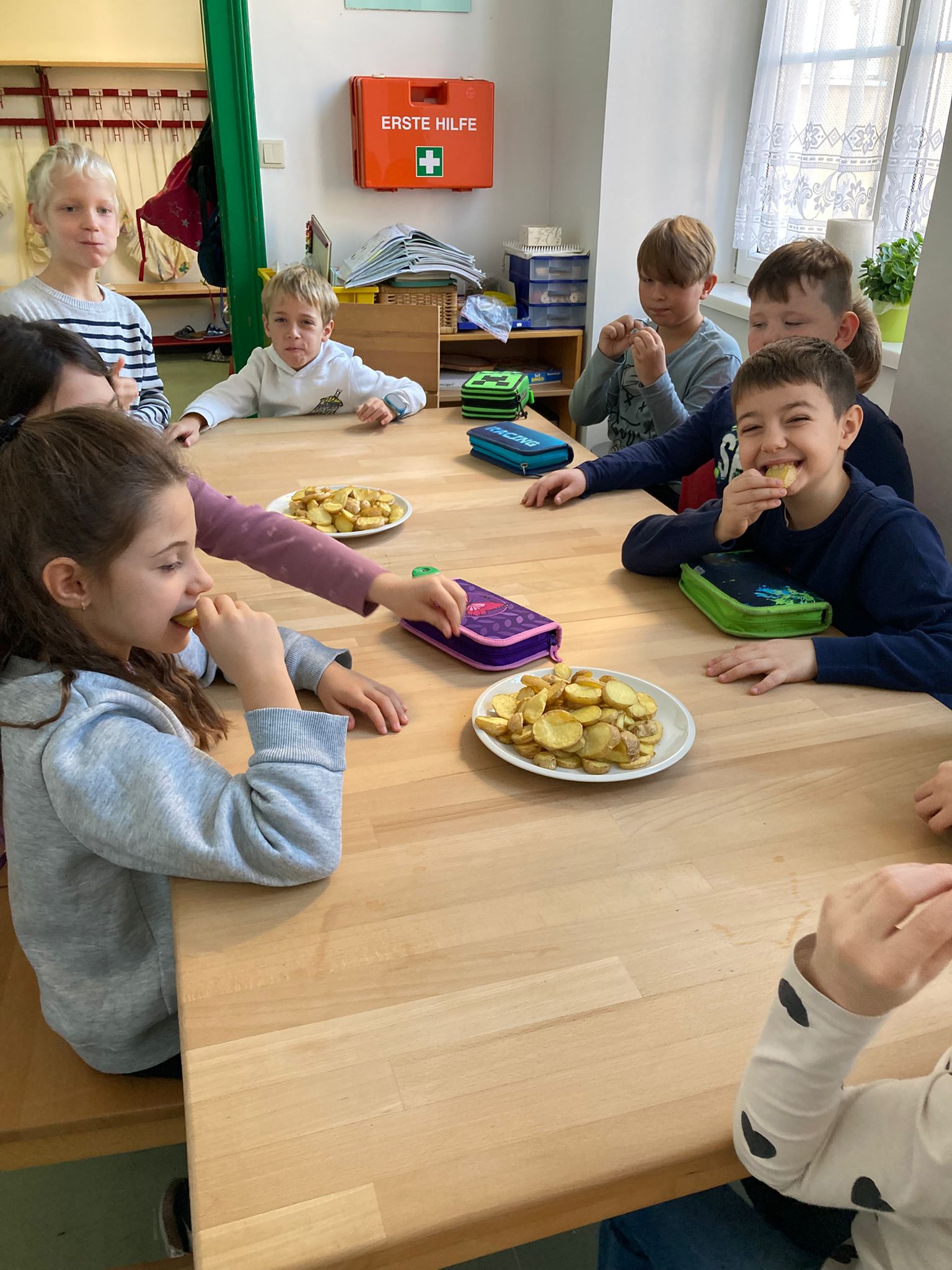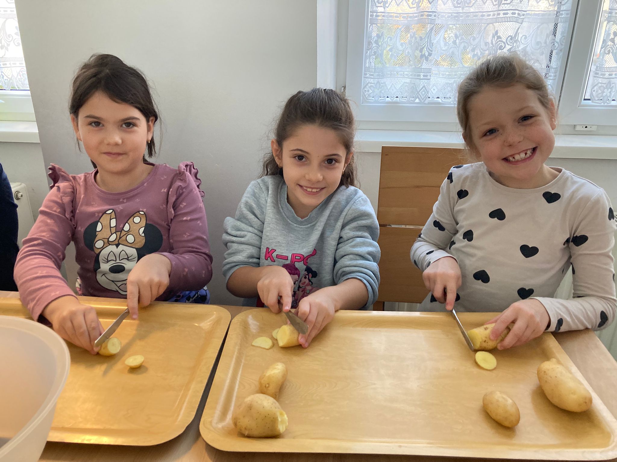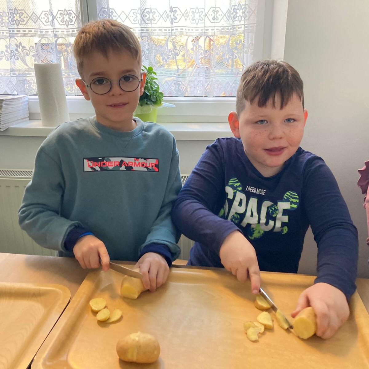 Am 4. November war es so weit - die Kartoffelernte der 3. Klasse wurde endlich verwertet. Dazu marschierten die Kinder 2. Klasse gemeinsam mit ihrer Lehrerin in die Küche, um dort mehrere Kilo Erdäpfel zu schneiden (hier ein Dankeschön an unsere Schulwartin, die zuvor die gesamte Ernte ordentlich gewaschen hat).